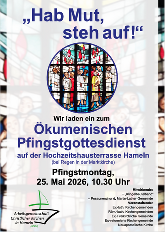 "Hab Mut, steh auf!" Pfingstmontag, 25. Mai 2026 um 10.30 Uhr, ökumenischer Gottesdienst auf der Hochzeitshausterrasse. Von und mit dem ACKH